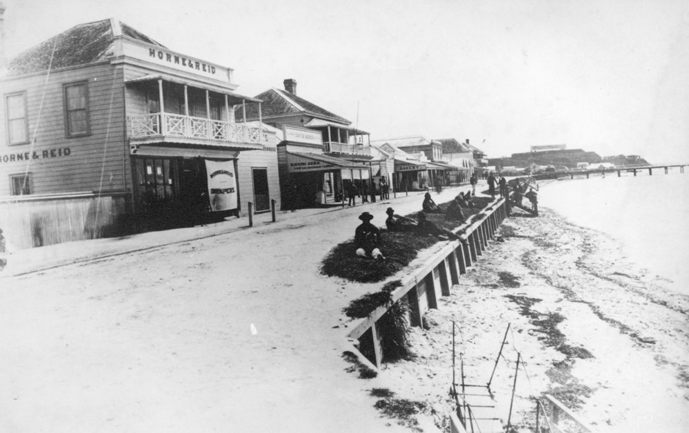 Datec. 1883Reference NumberPhoto 04-250DescriptionThe Strand, Tauranga, looking north, c. 1883. Horne & Reid operated 1878-1885. Shows wooden seawall and beach. FormatPrintPhysical Descriptionblack and white print