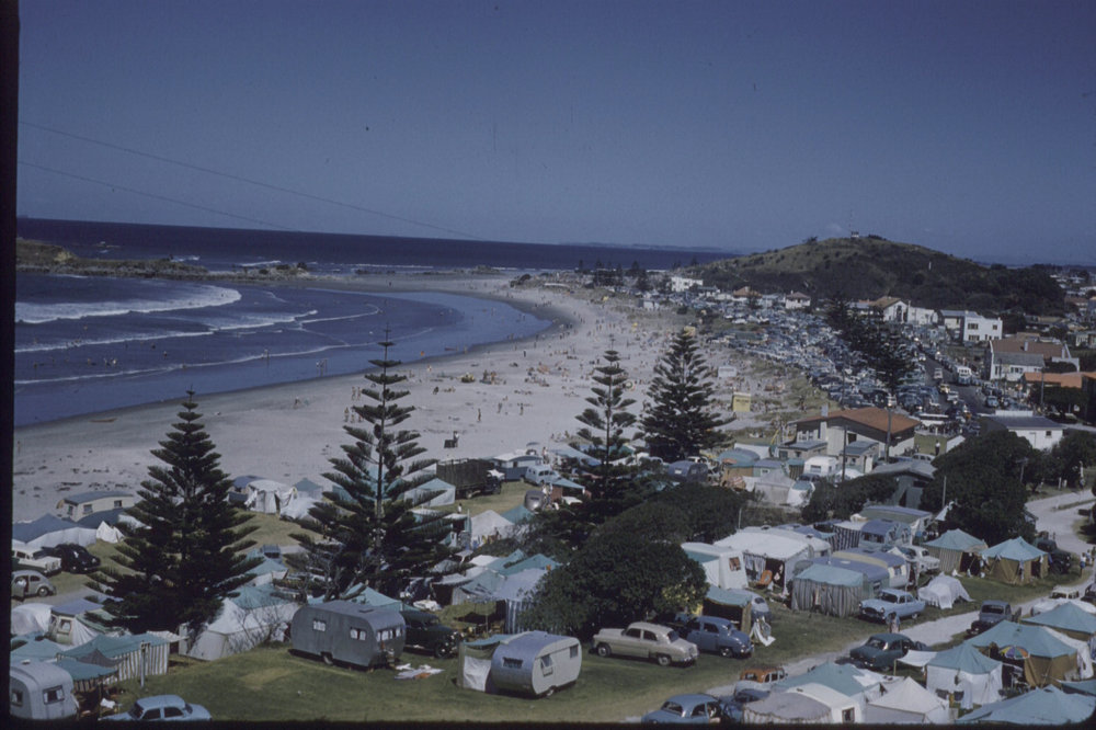Date1960Reference NumberPhoto 04-352DescriptionOcean Beach, Mount Maunganui, from Mauao, looking over crowded sands towards Mount Drury (Hopukiore), New Year's Day 1960.