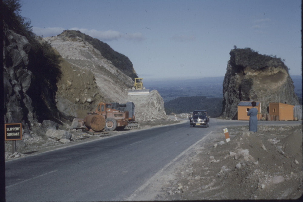 Date1963Reference NumberPhoto 04-377DescriptionNew cutting at the top of the Kaimai road, 1963FormatPositivePhysical DescriptionSlide
