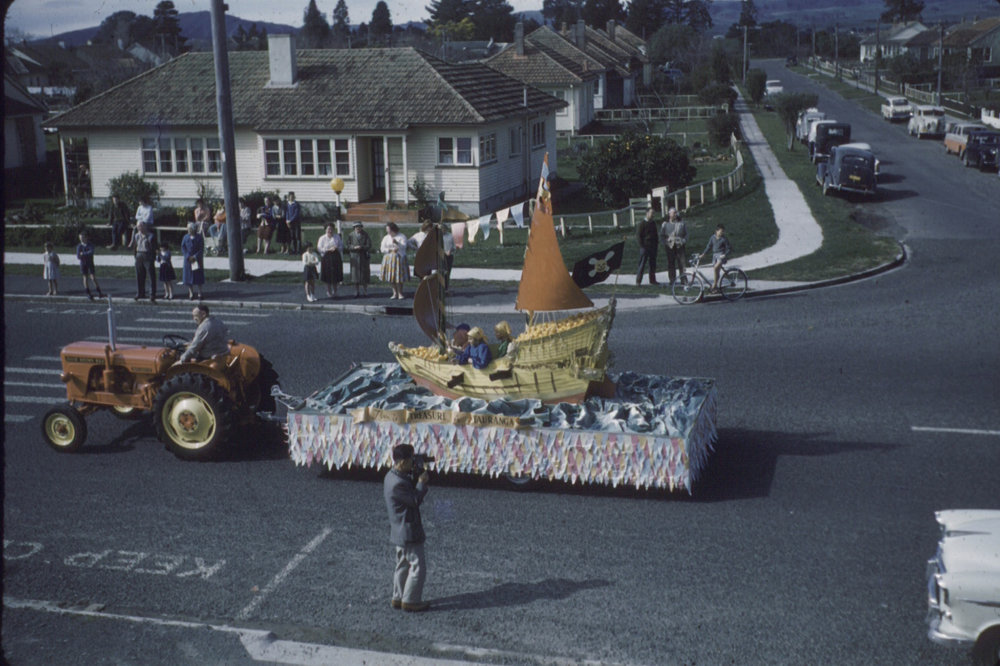 Date1961-1970Reference NumberPhoto 04-407DescriptionOrange Festival 1960-1970: float passing along Cameron Road, Tauranga. This float is also seen at the 5-minute mark on this Norman Blackie home video. FormatPrintPhysical Descriptionslide
