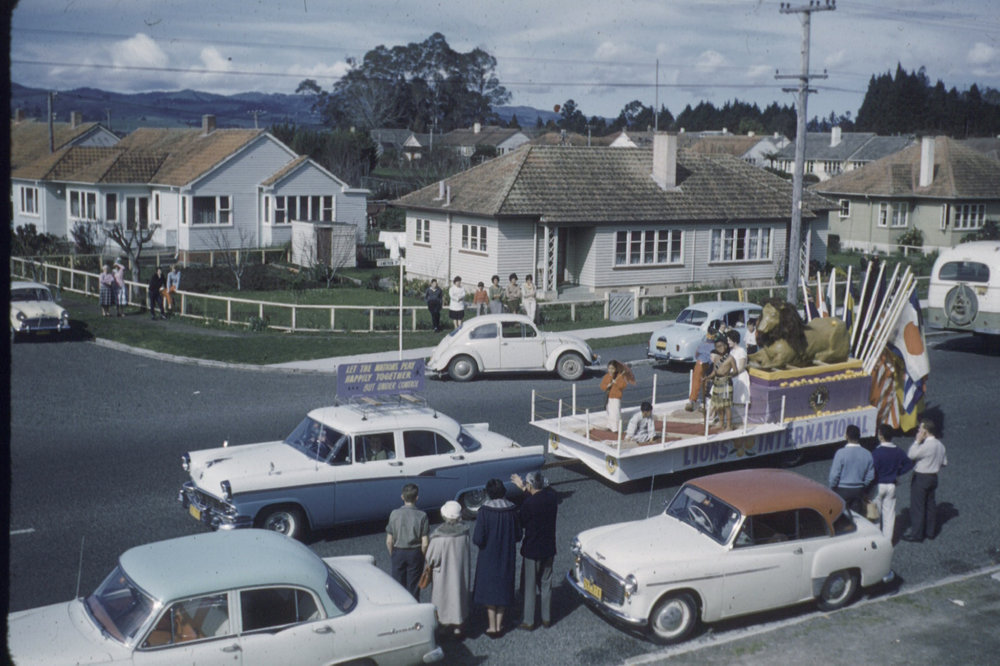 Date1961-1970Reference NumberPhoto 04-411DescriptionOrange Festival 1961-1970: Lions float passing along Cameron Road, Tauranga. Floats photographed at the same time appear in this 1962 home video footage by Norman Blackie. FormatPositivePhysical DescriptionSlide