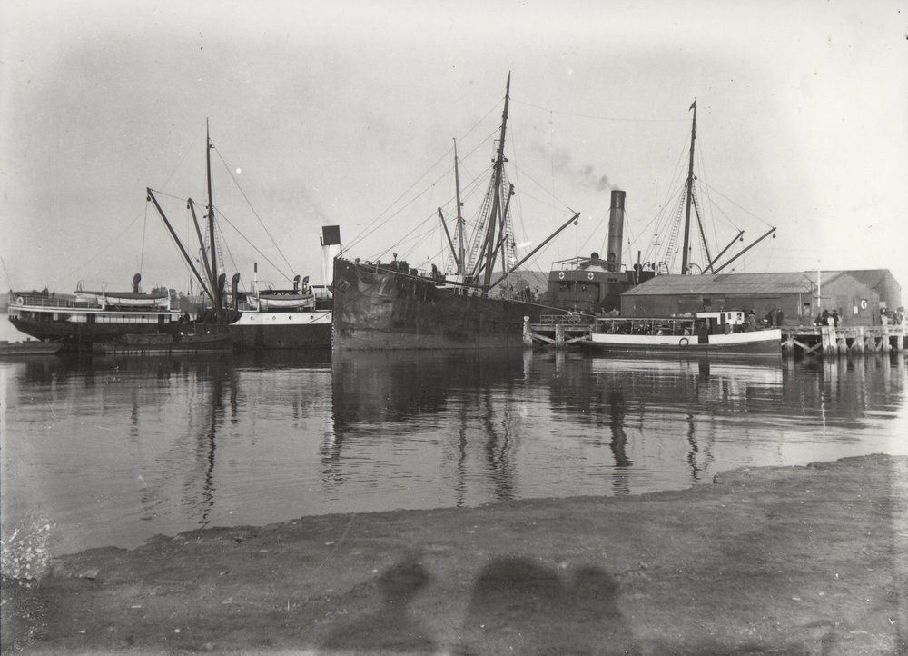 Datec. 1922Reference NumberPhoto 04-515DescriptionThe Town Wharf, Tauranga c1922. The vessel with the white funnel and black top is the Ngapuhi. The Faulkner's ferry alongside the wharf is the Ruru. FormatPrintPhysical Descriptionblack and white print