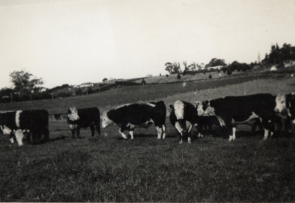DateMay 1940Reference NumberPhoto 04-529DescriptionCattle on Matheson farm, Ōtūmoetai, May 1940. Cattle trucks just visible between two beasts to left.FormatPrintPhysical Descriptionblack and white print