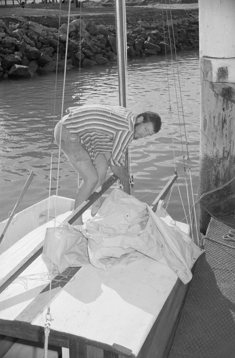 Date03 May 1969Reference NumberPhoto pn-2101DescriptionBoarding a yacht (?laser). Photograph taken for magazine number 83 of the Bay of Plenty Photo News, 3 May 1969FormatNegative