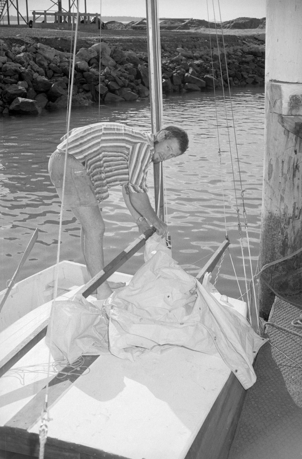 Date03 May 1969Reference NumberPhoto pn-2102DescriptionBoarding a yacht (?laser). Photograph taken for magazine number 83 of the Bay of Plenty Photo News, 3 May 1969FormatNegative
