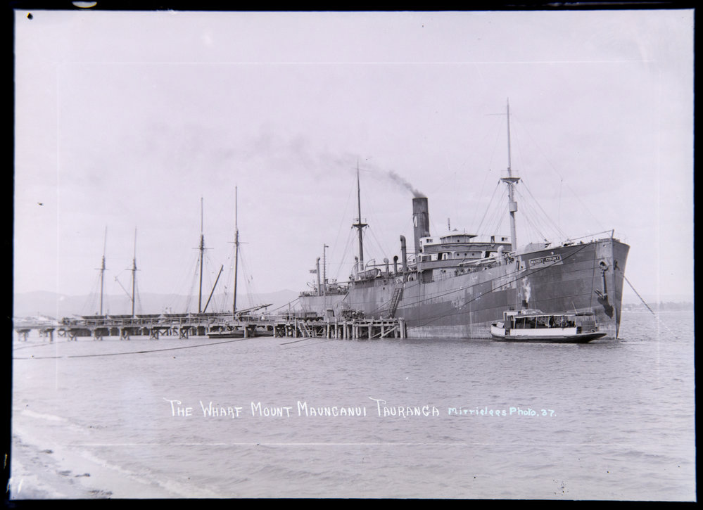 "The Wharf, Mount Maunganui Tauranga (S.S. Maindy Court)" (c. 1910s to 1930s). Pae Korokī, accessed 26/03/2026, https://paekoroki.tauranga.govt.nz/nodes/view/3012