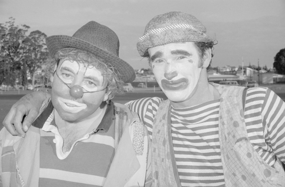 Date28 June 1969Reference NumberPhoto pn-2978DescriptionBig Top comes to town: the clowns. Photograph taken for magazine number 85 of the Bay of Plenty Photo News, 28 June 1969, p.4FormatNegative