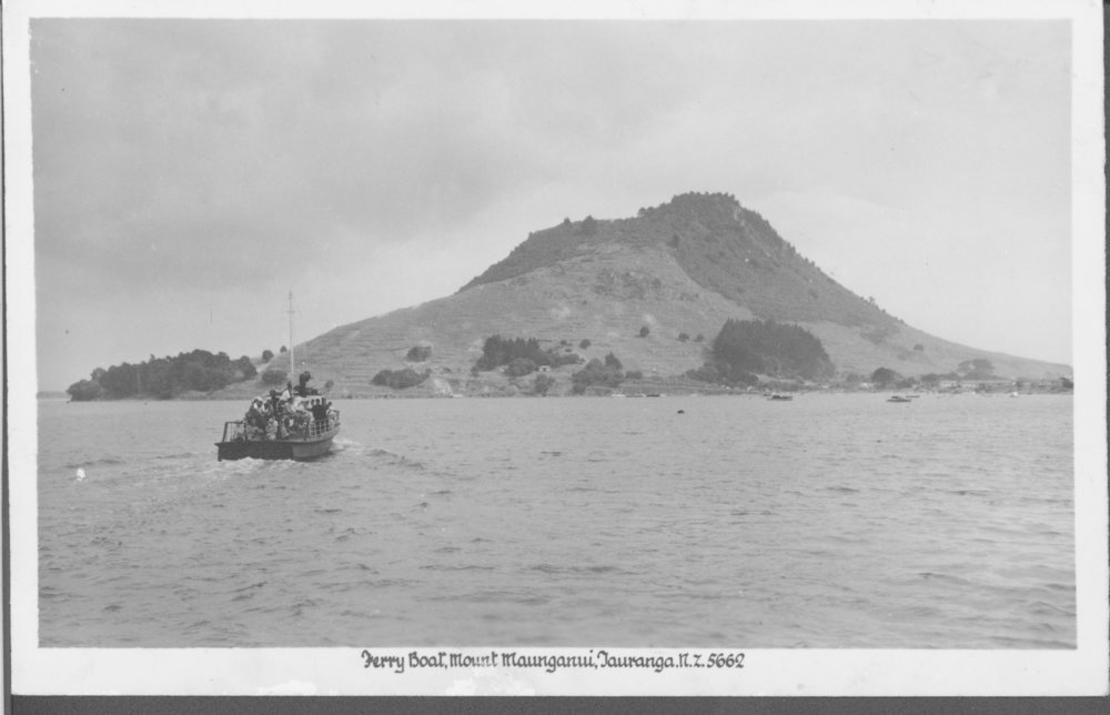 Datec. 1950Reference NumberPhoto 99-021DescriptionCaption: Ferry boat, Mount Maunganui, Tauranga N. Z. 5662. View of Mauao from Tauranga harbour, with Faulkner's ferry on left c. 1950FormatPrintPhysical Descriptionblack and white postcardSource of AcquisitionIan McCutcheon
