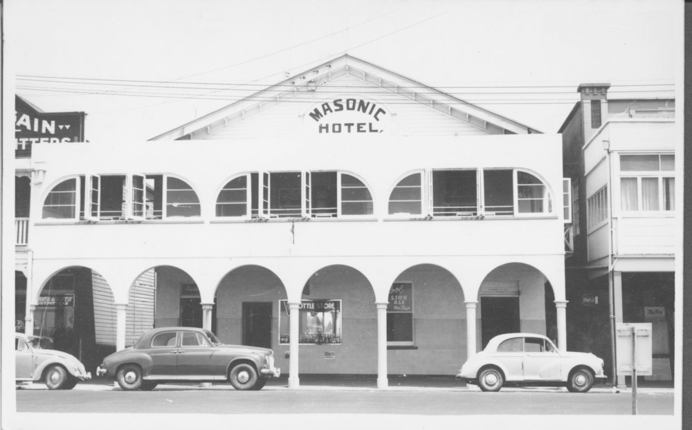 Date1970sReference NumberPhoto 99-085DescriptionThe Masonic Hotel, on The Strand in Tauranga, during the 1970s, it was demolished in 1993.FormatPrint