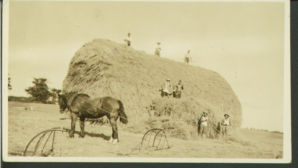 Datec. 1930sReference NumberPhoto 99-1044DescriptionPrior to metadata upgrade, was described as follows: Haymaking on Tilbys' Arawa farm, Ōtūmoetai. Left to right on stack: B. Marsh, C. Collingwood, Ray Tilby. On waggon, Max Marsh, Paul Robson (?), Toko (Togo?) Matthews, Kohu. 1930sFormatPrintPhysical Descriptionsepia printSource of AcquisitionAudrey Tilby Photographer/CreatorTilby family