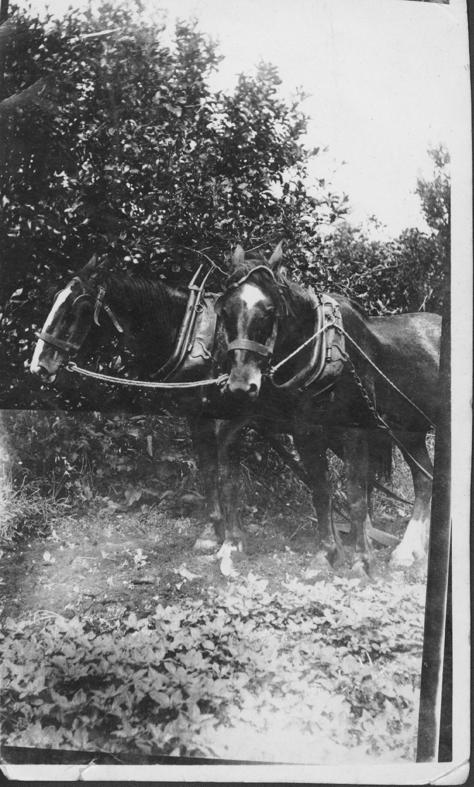 Date1930sReference NumberPhoto 99-1064DescriptionHorses working in the Tilby orchard, Matua in Ōtūmoetai (Tauranga) - Beauty and Darkie. 1930s. FormatPrintPhysical Descriptionblack and white printSource of AcquisitionAudrey Tilby Photographer/CreatorTilby family