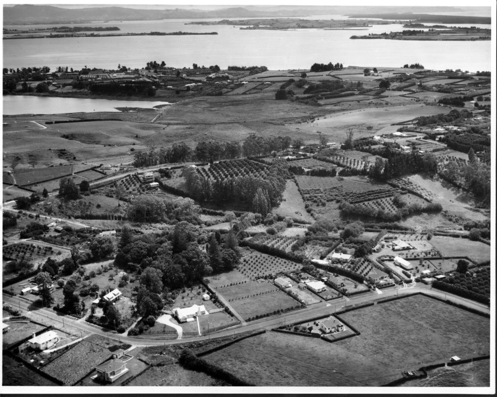 Datec. 1960sReference NumberPhoto 99-1090DescriptionAerial view with Grange Road in the foreground and Ōtūmoetai Road left to right in centre. Big clump of trees marks Maungawhare (left foreground). Former Tollemache farm, left middle distance, Matua peninsula beyond Matua-iwi pā site as marked by a clump of trees about one third in from left side of the photo along the edge of the Matua peninsula. For early survey see cadastral plan SO428. c 1960. FormatPrintPhysical Descriptionblack and white printSource of AcquisitionCon Lever Photographer/CreatorWhite, Leo Lemuel, 1906-1967