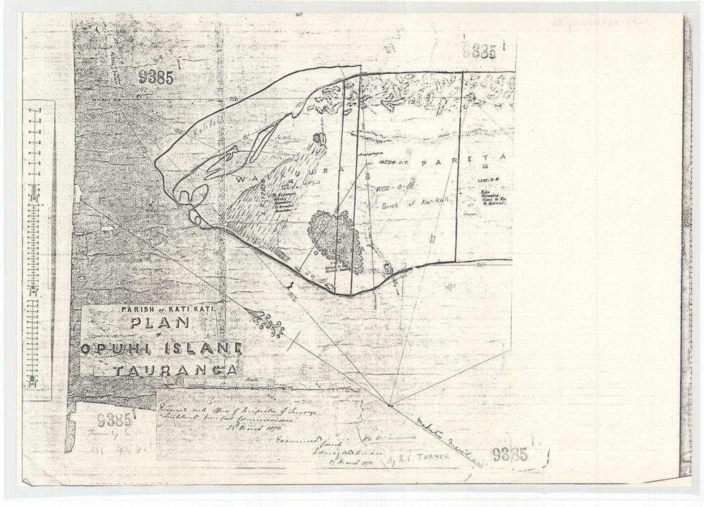 Land Information New Zealand: Toitū te whenua, Plan of Opuhi Island: 9385 (1870). Pae Korokī, accessed 27/03/2026, https://paekoroki.tauranga.govt.nz/nodes/view/32917