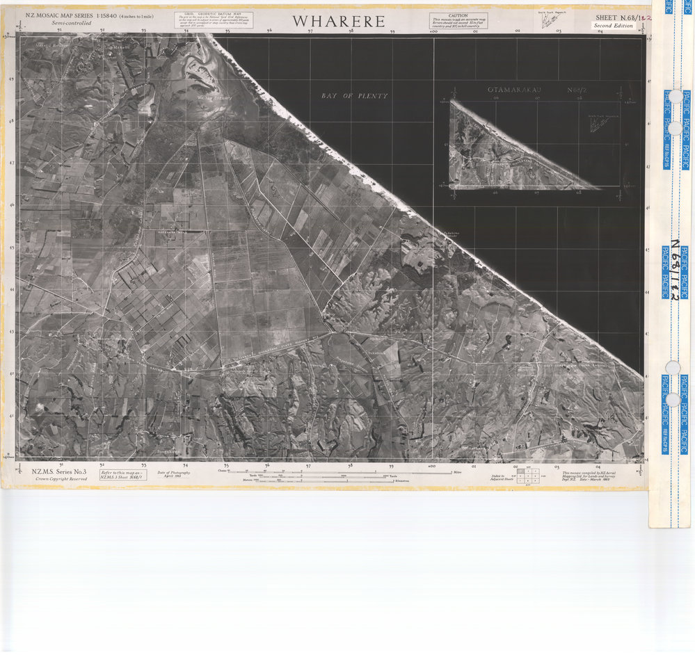DateMarch 1965Reference NumberMap 20-319DescriptionAerial photograph of Wharere. N.Z.M.S. 3 Sheet N68/1&2. Second EditionBarcodeWHARERE - SHEET N.68-1 AND 2CreatorLand Information New Zealand: Toitū te whenuaNZ Aerial Mapping LtdPhysical DescriptionBlack and white map size is 67cm x 91cmScale1:15840 (4 inches to a mile)