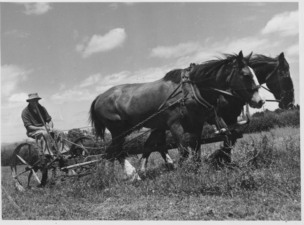Date1950sReference NumberPhoto 99-1266Description Ray Tilby mowing hay on his Arawa farm, Ōtūmoetai, (Matua), late 1950s. FormatPrintPhysical Descriptionblack and white printSource of AcquisitionTilby, John