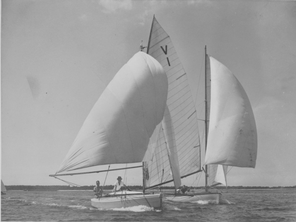 Date1946Reference NumberPhoto 99-1269DescriptionWizard" in 1946, at that time owned solely by Ray Tilby, who had bought out his brother Charles. Sailing on Tauranga harbour, Jim Lever (left) and Ray (right). FormatPrintPhysical Descriptionblack and white printSource of AcquisitionTilby, John