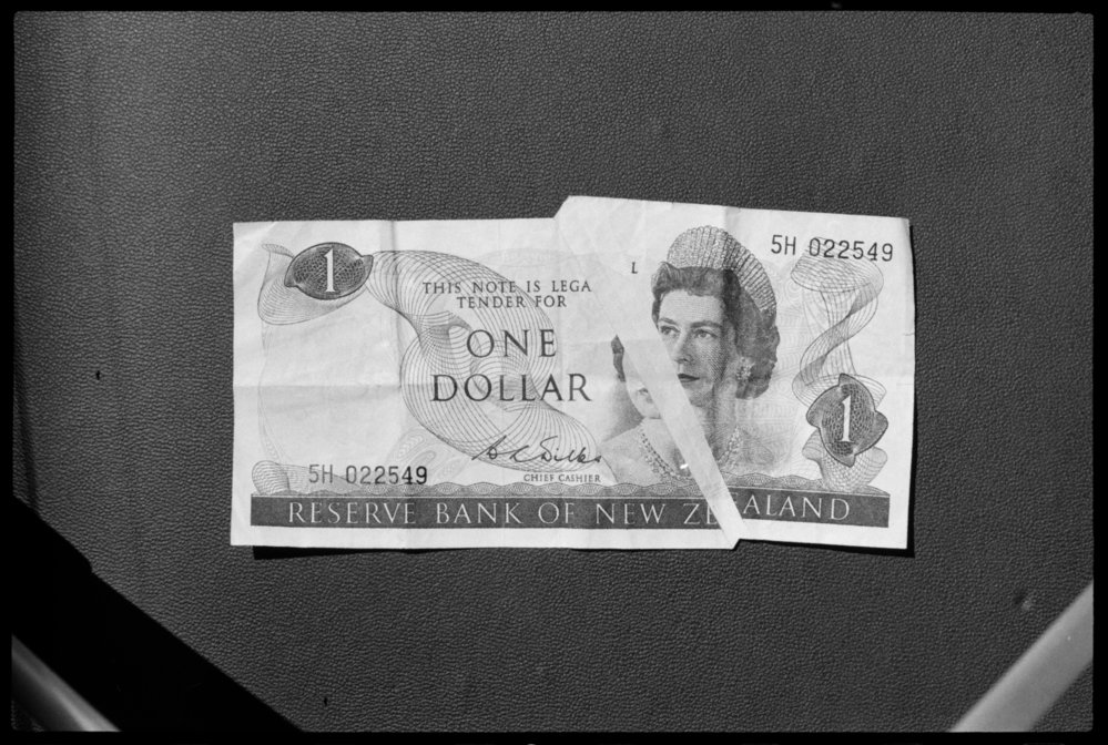 Date13 December 1969Reference NumberPhoto pn-5578DescriptionDollar note. Photograph taken for magazine number 91 of the Bay of Plenty Photo News, 13 December 1969.