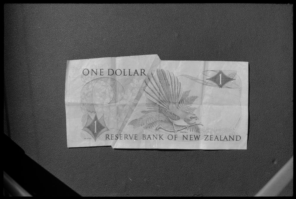 Date13 December 1969Reference NumberPhoto pn-5579DescriptionDollar note. Photograph taken for magazine number 91 of the Bay of Plenty Photo News, 13 December 1969.
