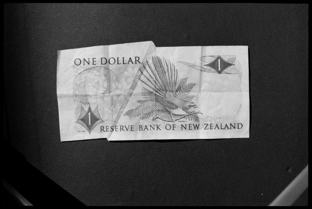 Date13 December 1969Reference NumberPhoto pn-5581DescriptionDollar note. Photograph taken for magazine number 91 of the Bay of Plenty Photo News, 13 December 1969.