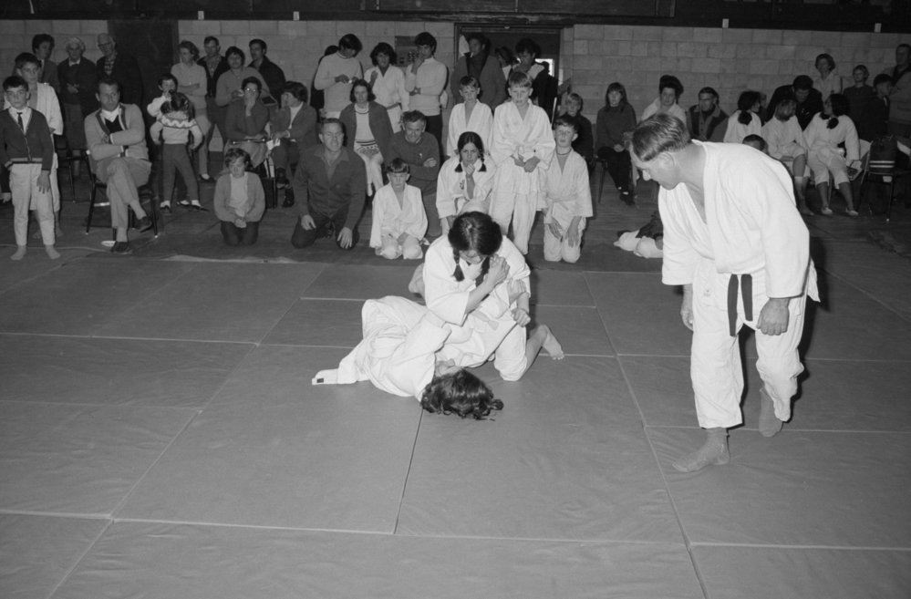 Date26 July 1969Reference NumberPhoto pn-3333DescriptionJudo at the Mount: Maureen Young and Jeanette Hobart in action. Photograph taken for magazine number 86 of the Bay of Plenty Photo News, 26 July 1969, p.73FormatNegative