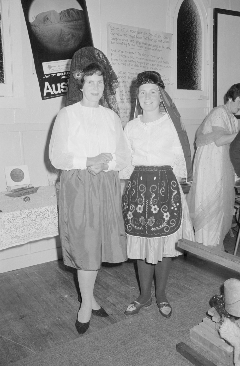 Date23 August 1969Reference NumberPhoto pn-3846DescriptionInternational evening: Evelyn Wallbank & Leone Woodcock. Photograph taken for magazine number 87 of the Bay of Plenty Photo News, 23 August 1969, p.59FormatNegative