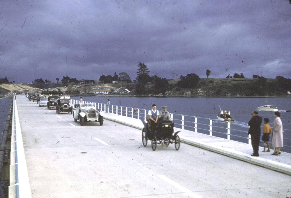 Date1960sReference NumberPhoto 06-152DescriptionVintage car procession across the Maungatapu causeway, circa early 1960s. Auto colour applied.FormatPrintPhysical Descriptioncolour slide