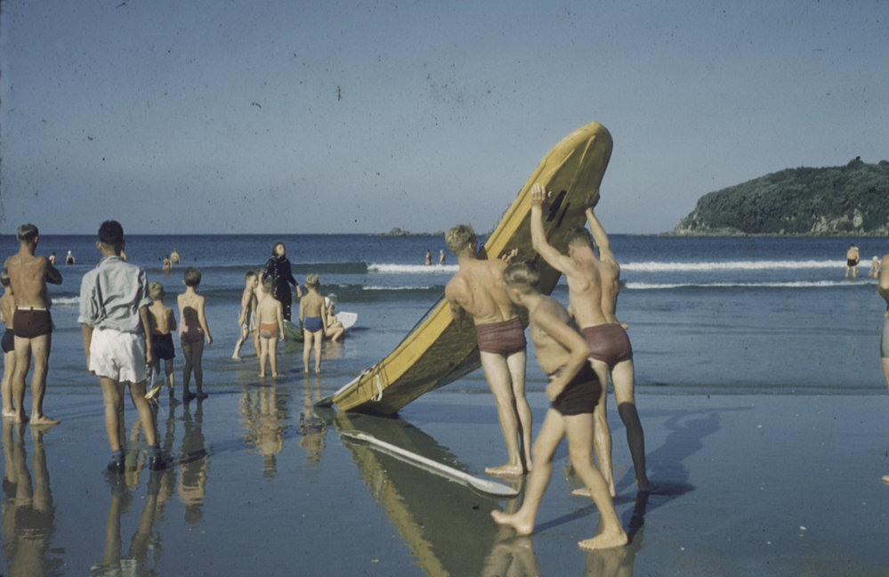 Date1960sReference NumberPhoto 06-168DescriptionMount Maunganui Surf Club members on Ocean Beach with wave board, late afternoon in summer, early 1960s.FormatPrintPhysical Descriptioncolour slide