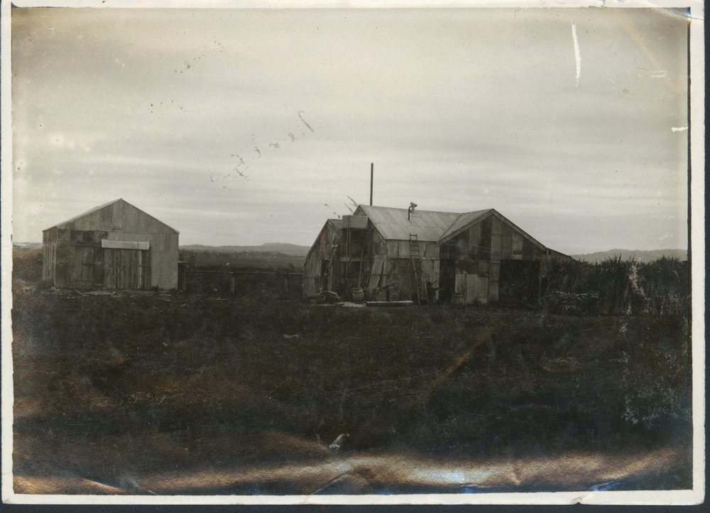 Datec.1908Reference NumberPhoto 07-002DescriptionProbably the Rangiuru flax mill (Paterson's), on the Kaituna, circa 1908.FormatPrintPhysical Descriptionblack and white print