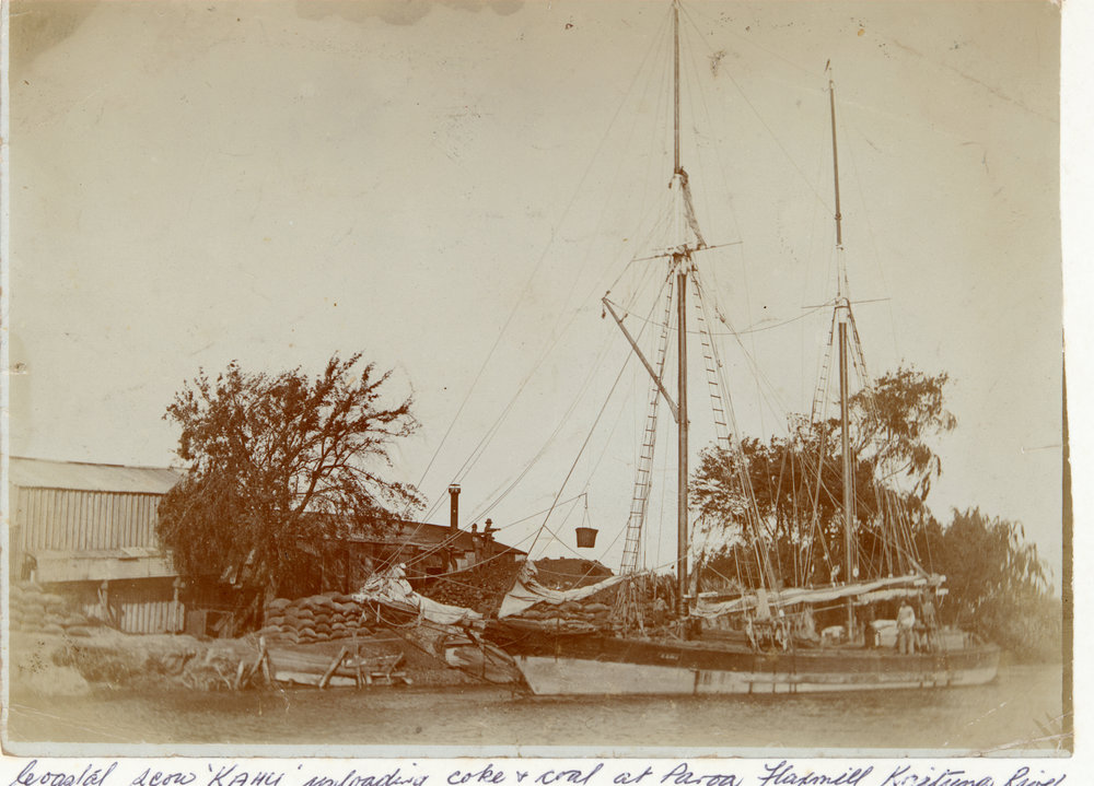 Datec.1910Reference NumberPhoto 07-008DescriptionCoastal scow 'Kahu' unloading coke and coal at Paroa flax mill, Kaituna River, circa 1910. Same image as 00-383, but a better quality original print. Written in pen on back of mount: The old engine-driver's name was Ole Haukland (Norwegian) - not spelt Auckland but pronounced sounding like our Auckland) He was in charge of Paroa Mill and the Rangiuru Mill and worked for Dad [Jim Paterson] up til the time of the disastrous flax fire in January 1912.FormatPrintPhysical Descriptionblack and white print