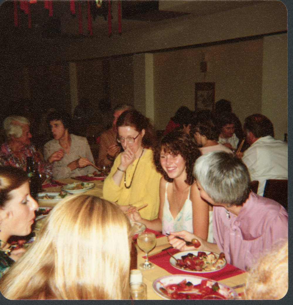 Date1981Reference NumberPhoto 07-135DescriptionTauranga Public Library, 1981: farewell dinner for Miss Morgan, librarian. Left to right, Charlotte (in profile, surname not given), Pat Scott (nee Phelan), Miss Morgan, Moray Guise (in yellow), Fran (surname not given), Joan Aiken. FormatPrintPhysical Descriptioncoloured print