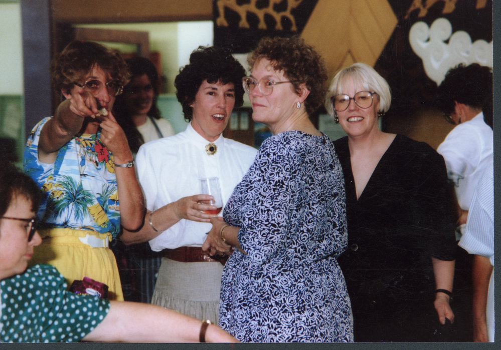 Datec.1990Reference NumberPhoto 07-144DescriptionLibrary staff at Mount Maunganui, circa 1990: in centre, Elizabeth McMaster (Mount Maunganui, white shirt), Jinty Rorke (Tauranga), Diane Taggart (Mount Maunganui). Raewyn Adams photo.FormatPrintPhysical Descriptioncoloured printPhotographer/CreatorRaewyn Adams