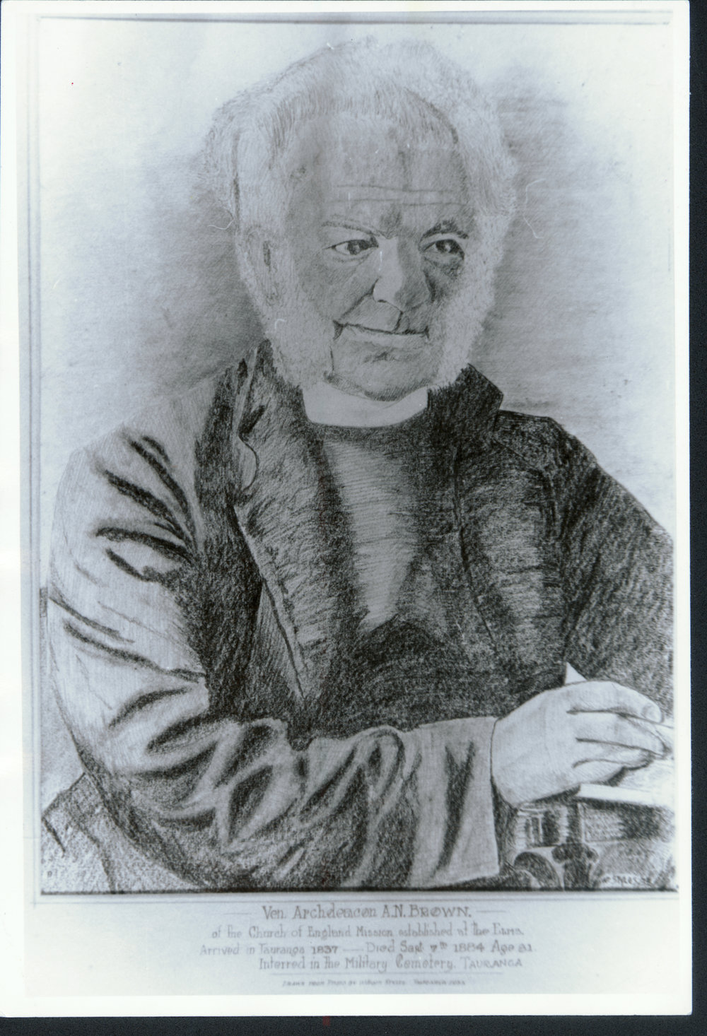 Reference NumberPhoto 07-170DescriptionArchdeacon Alfred Nesbitt Brown, of The Elms. Photograph of a pencil sketch in the Sladden Library (= New Zealand Room), Tauranga Library.FormatPrintPhysical Descriptionblack and white print
