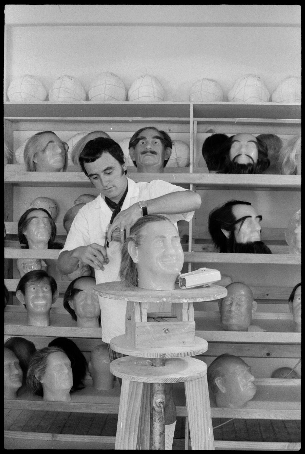 Accompanying caption: Short back and sides? - or the Customer Who can't Talk Back. In this case, Dave Loughlin trims up a wax head of Mr Gorton, Australia's Prime Minister. It's one of the many heads made in a Tauranga factory and destined for overseas wax museums.