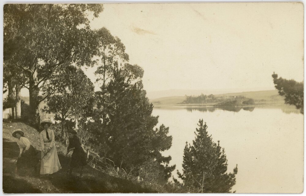 Datec. 1912Reference NumberPhoto 99-717DescriptionWaikareao estuary, Tauranga, from Mary Humphreys' front gate, Hamilton Street, showing Motuopae (Peach Island) in the background. c. 1912. Handwritten on reverse: This is a photograph taken from the front gate with Hilda, Con & Sissie about to start out for a game of golf. Love from Mother.