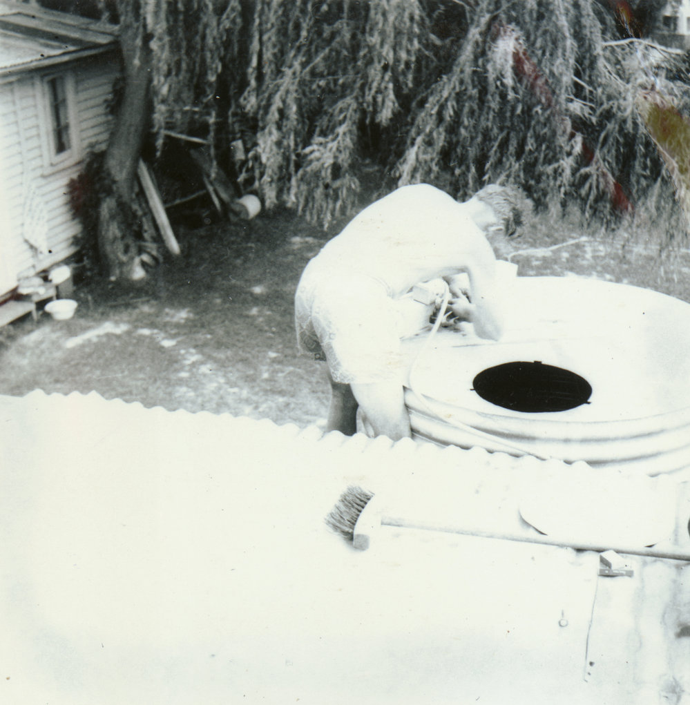 Date1964Reference NumberPhoto 05-411DescriptionNeil Holmes cleaning out tanks, 1964. Holmes Holiday Haven, Te Puna, on the shores of Tauranga harbour; early 1960s.FormatPrintPhysical Descriptionblack and white print