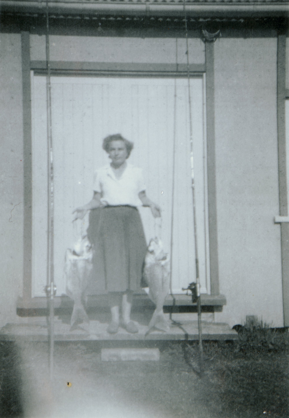 Date1959Reference NumberPhoto 05-433DescriptionDoris Holmes with fish. Caption: "Our first fish April 1959." Holmes Holiday Haven, Te Puna, on the shores of Tauranga harbour.FormatPrintPhysical Descriptionblack and white print