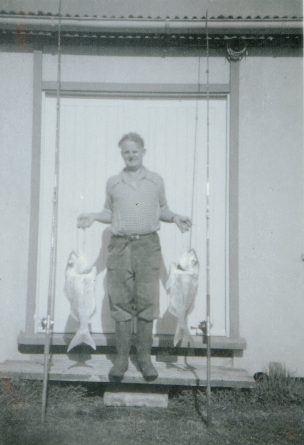 Date1959Reference NumberPhoto 05-434DescriptionNeil Holmes with fish. Caption: "Our first fish April 1959." Holmes Holiday Haven, Te Puna, on the shores of Tauranga harbour.FormatPrintPhysical Descriptionblack and white print