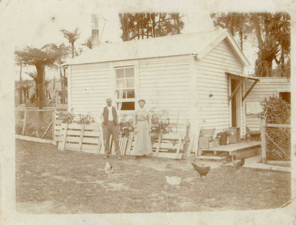 George, F Nell and his wife in front of their house at Whakamārama, c. 1910s (1910s). Pae Korokī, accessed 23/04/2026, https://paekoroki.tauranga.govt.nz/nodes/view/39079