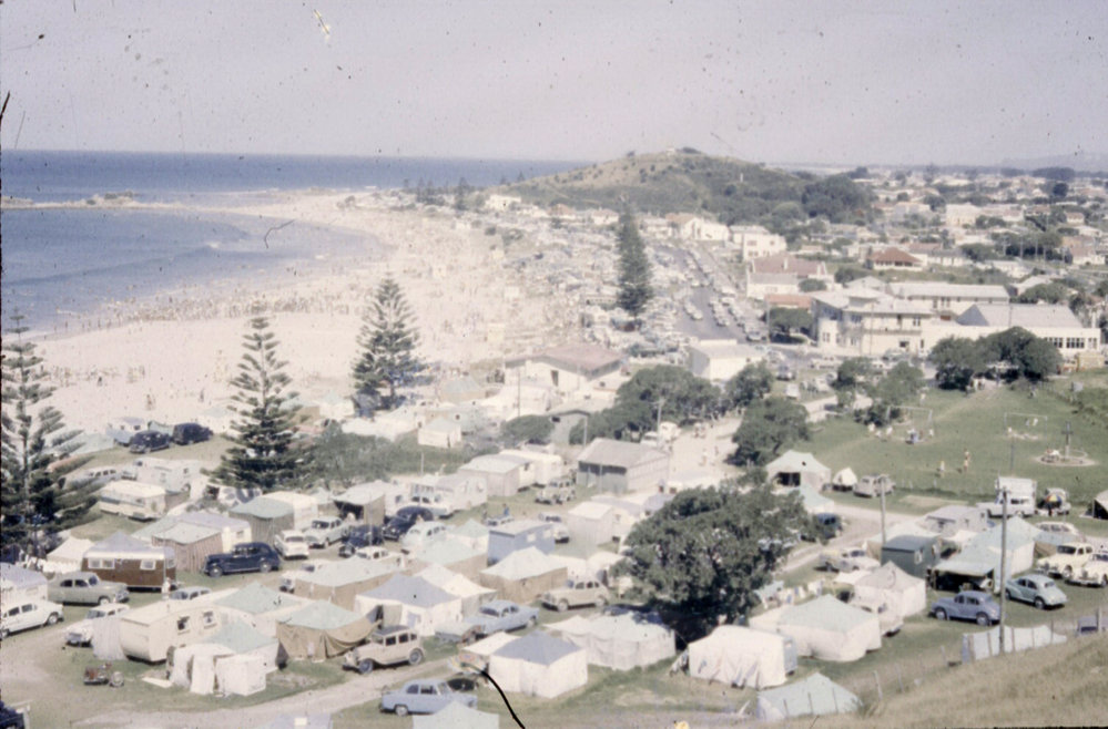 Datec. 1963Reference NumberPhoto 06-149DescriptionMount Maunganui summer: crowds at Ocean Beach and camping ground. Photo taken from the lower slopes of Mauao looking towards Hopukiore (Mount Drury). Oceanside Hotel visible centre right.FormatPrintPhysical Descriptioncol slide