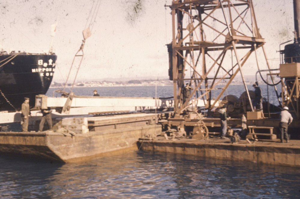 Date1960sReference NumberPhoto 06-161DescriptionFloating crane at Port of Tauranga, early 1960s.FormatPrintPhysical Descriptioncol slidePhotographer/CreatorDavid Kirk Murdoch