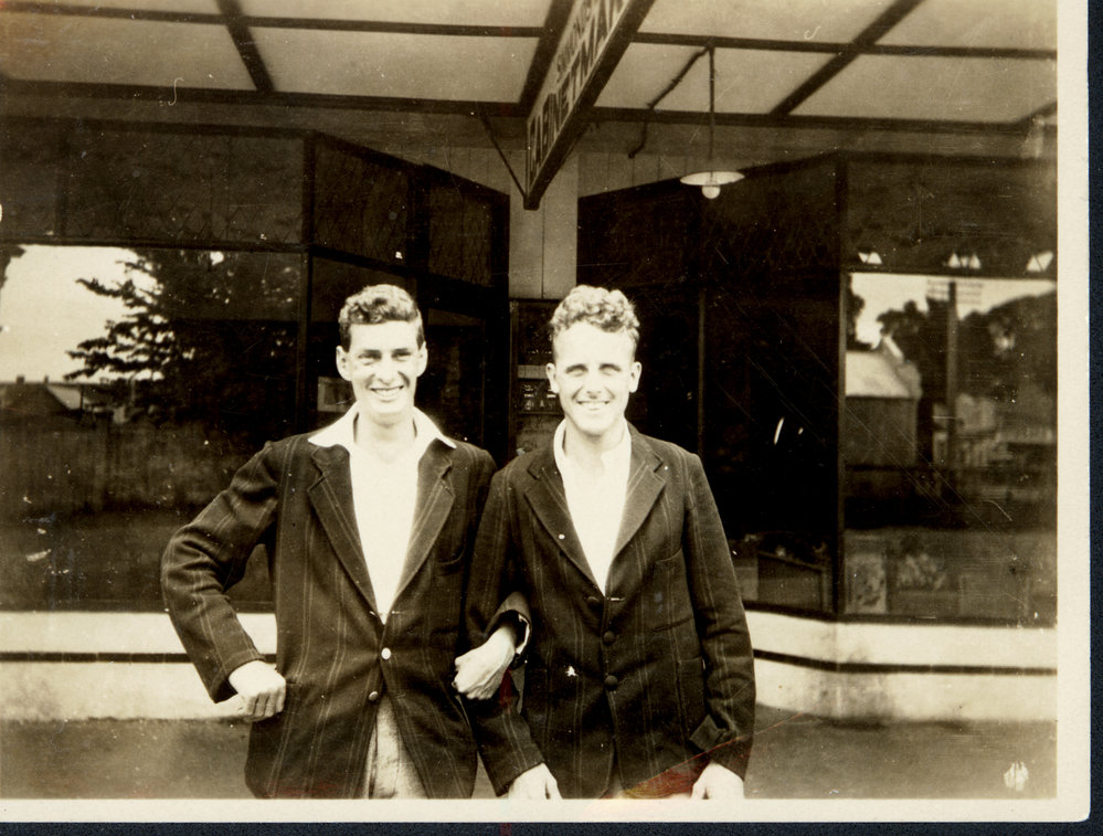 Date1929Reference NumberPhoto 06-198DescriptionGeoff Gibbs and Chum Denniston, rowers, outside Simons (or Symonds?) Furniture Shop in Wharf Street, Tauranga, on 26 December 1929. They had won the Junior Pair oar clinker boat 1 1/2 miles, and the Maiden Double Sculls (1 mile). FormatPrintPhysical Descriptionblack and white print