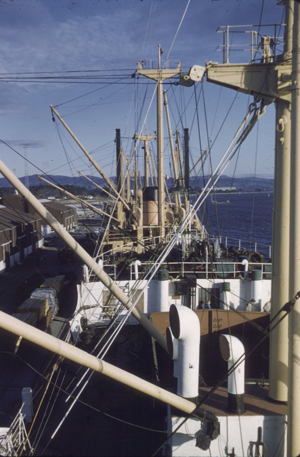 Date1960sReference NumberPhoto 06-438DescriptionMasts of ship in Port of Tauranga, Kaimai Ranges in the distance, c1960s.FormatPrintPhysical Descriptioncol slide