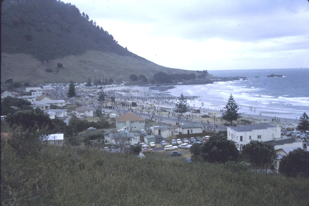 Date1960sReference NumberPhoto 06-475DescriptionOcean Beach, Mount Maunganui, from Hopukiore (Mount Drury), showing large crowd on beach, possibly for surf carnival; 1960s. Some adjustment of image colour made to original.FormatPrintPhysical Descriptioncol slidePhotographer/CreatorDavid Allan Murdoch