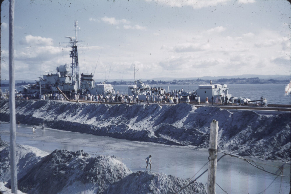 Naval vessel docked at Mount Maunganui, Port of Tauranga, 1960s