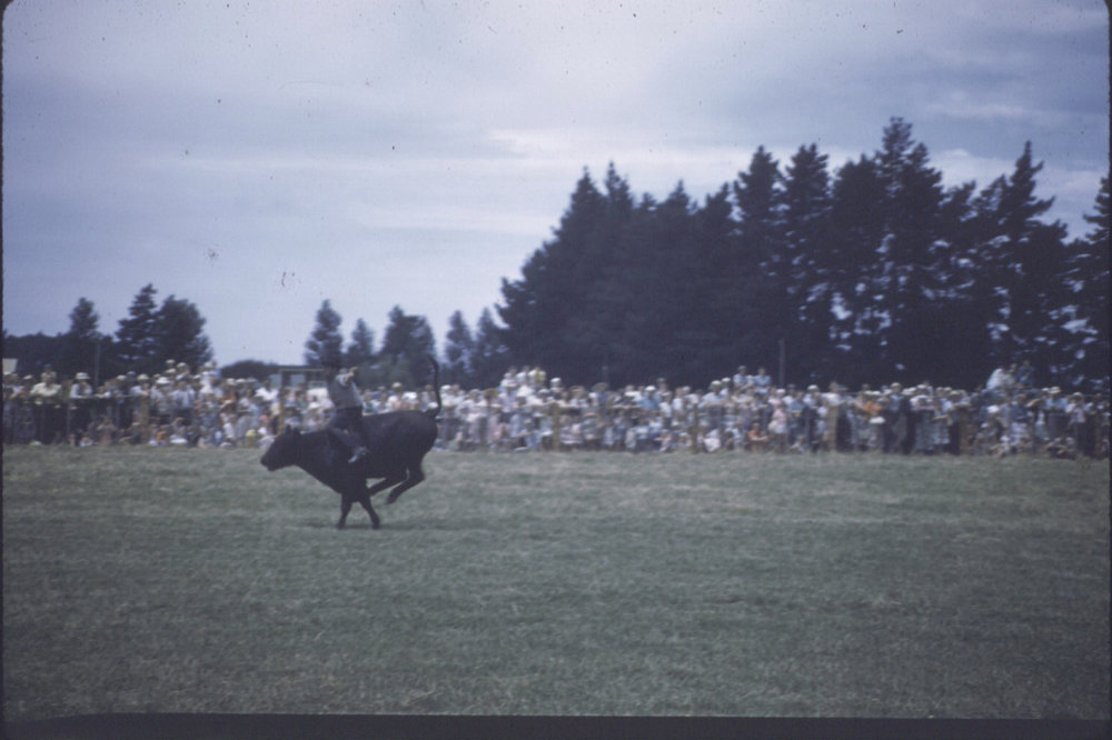 Date1960sReference NumberPhoto 06-484DescriptionMan riding cattle beast, rodeo scene with crowd, Tauranga, 1960s.FormatPrintPhysical Descriptioncol slidePhotographer/CreatorDavid Allan Murdoch
