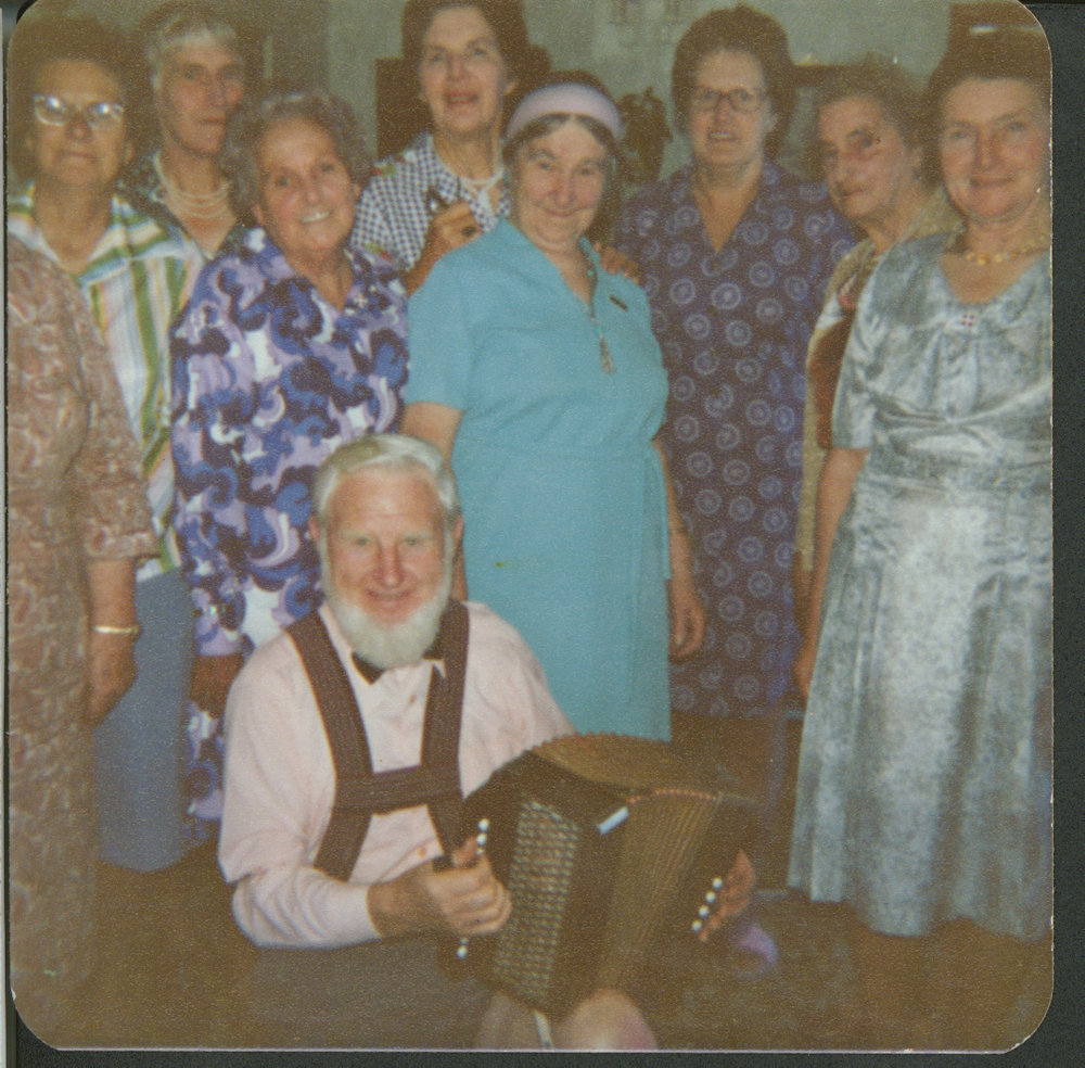 Reference NumberPhoto 99-851DescriptionCentre, turquoise dress Vi Simons (nee Crabbe). With piano accordion Mr Niederer. Behind Vi is June Skinner. FormatPrintPhysical Descriptioncoloured printSource of AcquisitionSimons, Vi