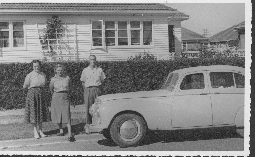 Reference NumberPhoto 99-853DescriptionJoan Mirrielees, centre, outside the Mirrielees home on Cameron Road. Source of AcquisitionJoan Mirrielees