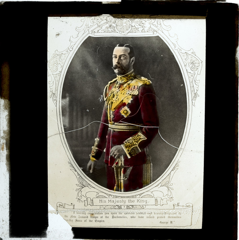 Date[c. 1900s-c. 1910s]Reference NumberPhoto bs-769DescriptionThree-quarter length portrait of King George V. Noted with file: His Majesty the King [with message to New Zealand troops at Gallipoli]FormatPositivePhysical DescriptionHand-coloured Black-and-white lantern slideSourcesDictionary of New Zealand Biography