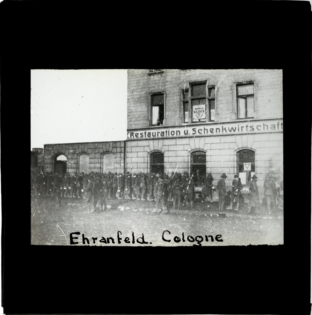 Soldiers lining up outside building in Ehranfeld, Cologne ([c. 1914-c. 1919]). Pae Korokī, accessed 05/04/2026, https://paekoroki.tauranga.govt.nz/nodes/view/40028