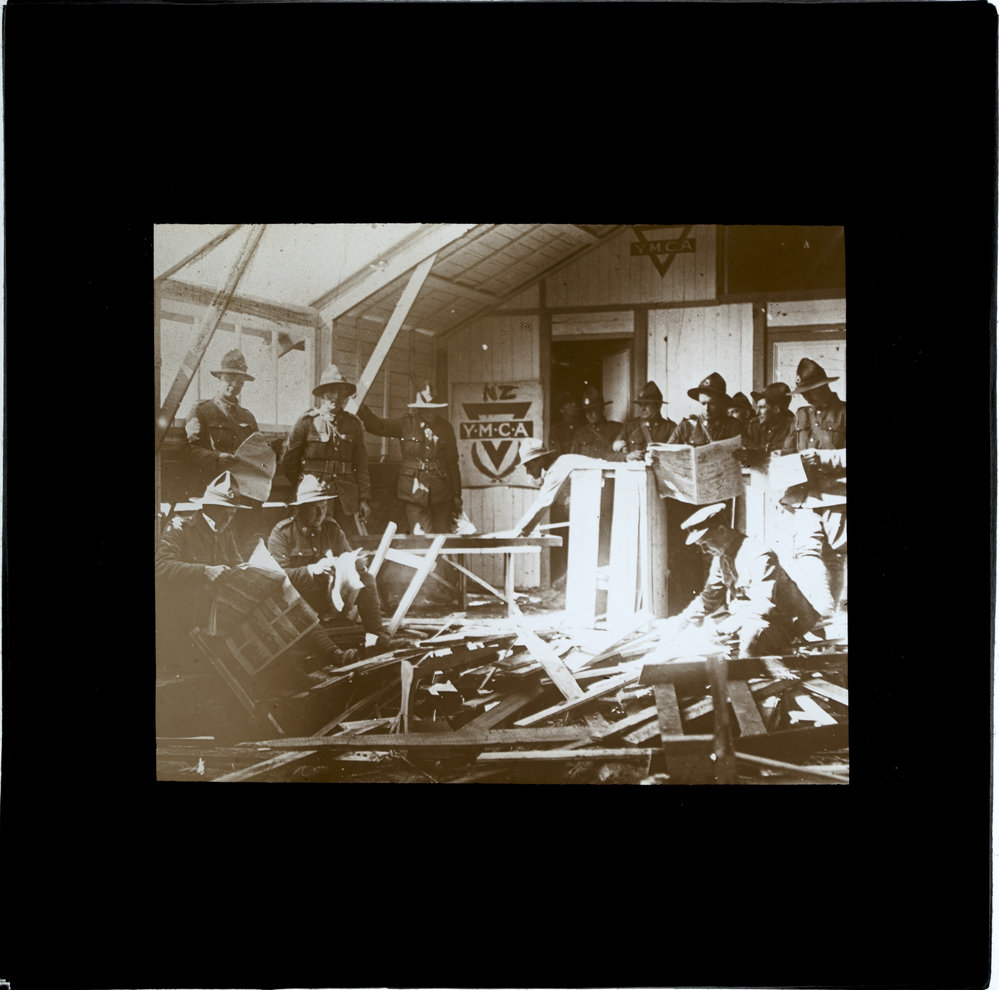 Soldiers reading newspapers in damaged YMCA Hut, Messines ([c. 1914-c. 1919]). Pae Korokī, accessed 05/04/2026, https://paekoroki.tauranga.govt.nz/nodes/view/40029